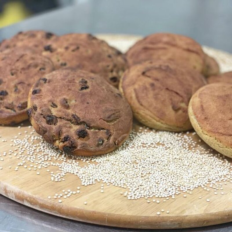 Utilizziamo farina di quinoa integrale biologica, acqua, sale, lievito gluten-free e 30 grammi di uvetta sultanina. Un velo di superficie con olio di vinacciolo ne preserva la morbidezza.